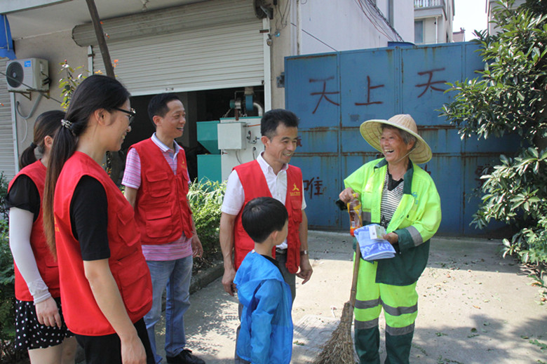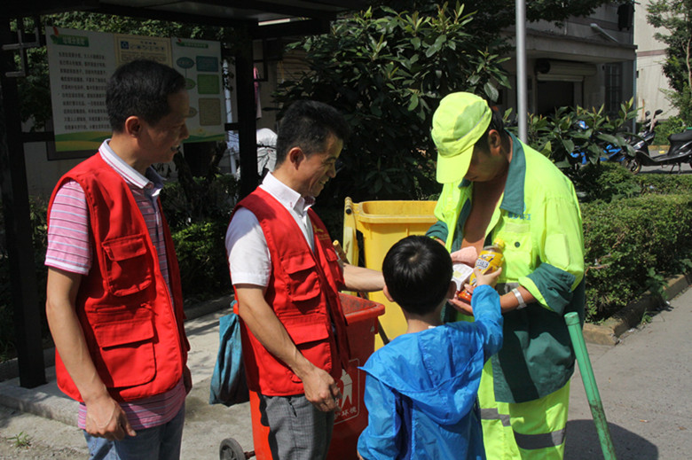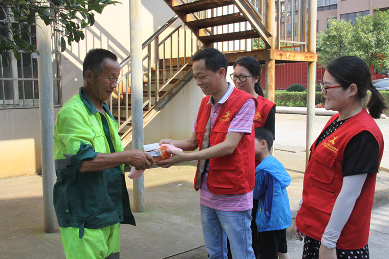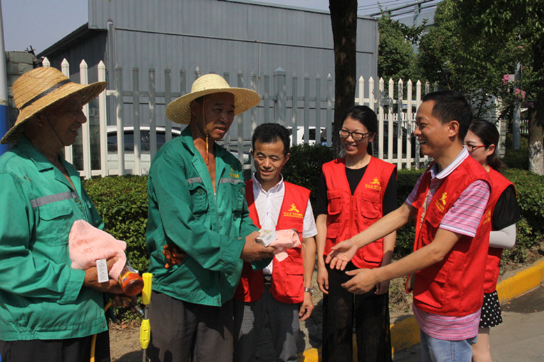 環(huán)衛(wèi)工人們感激地接過解暑物品,對(duì)匯才黨員們連聲道謝!