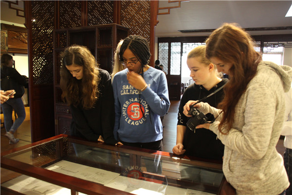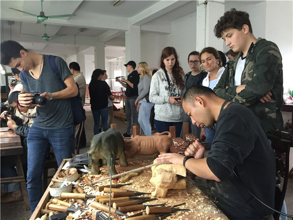 師生們參觀了博覽園的蘇作紅木博物館、蘇式園林沁檀園和雕花車間。師生們被江南蘇式園林的雅致清秀所吸引,流連于亭臺樓閣和九曲回廊之間。