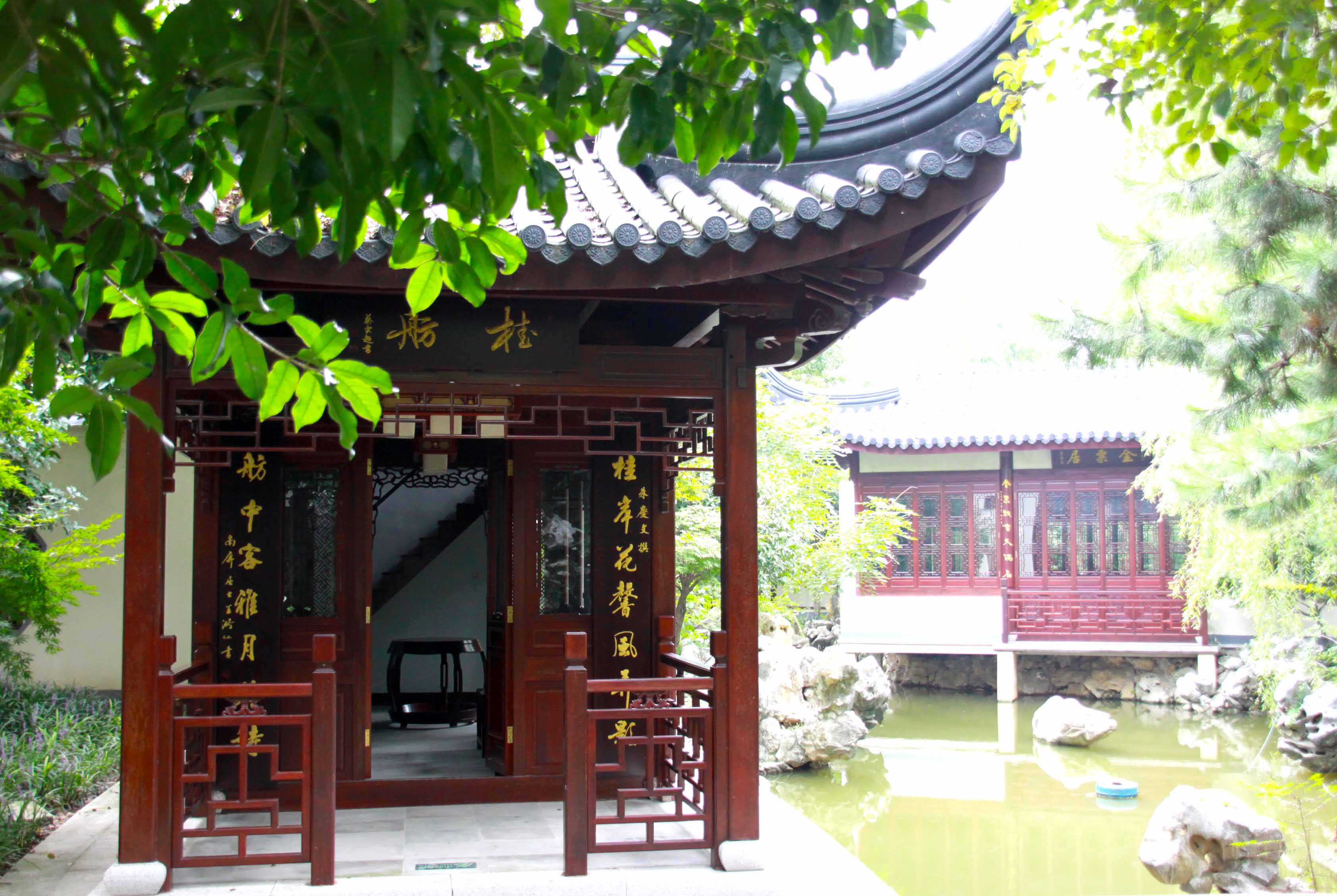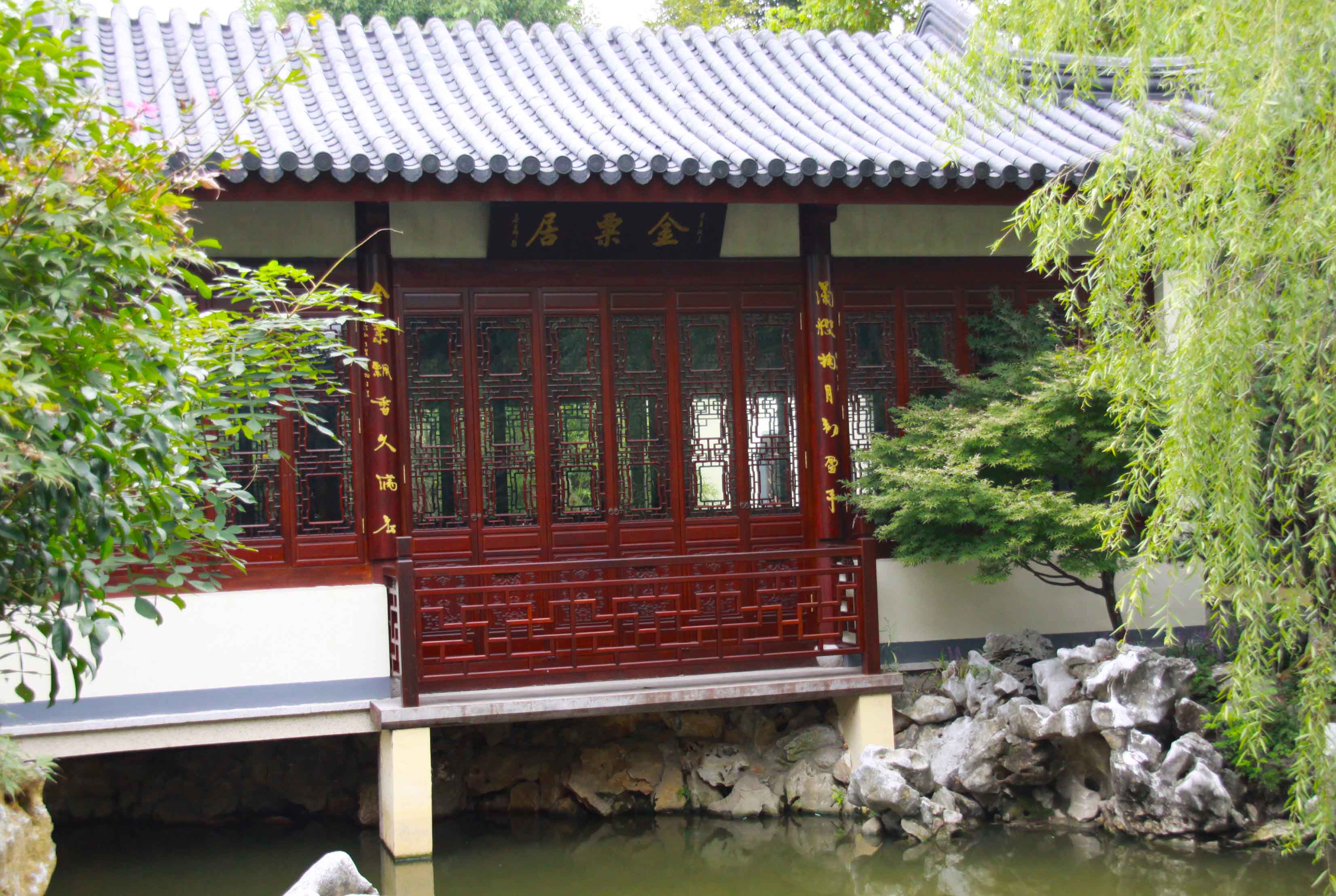 進月洞門向前有小徑可達桂舫,向左則為一小庭院,院內(nèi)有桂樹及湖石孤峰,故名“金粟居”,三開間書房架池而建,立于水面之上,環(huán)境幽美清朗,落地窗的室內(nèi),置紅木畫案書架,蘇作明式家具,簡潔精致,靜雅墨香。“翰逸神飛”橫匾點明了此間為揮毫潑墨之雅室。