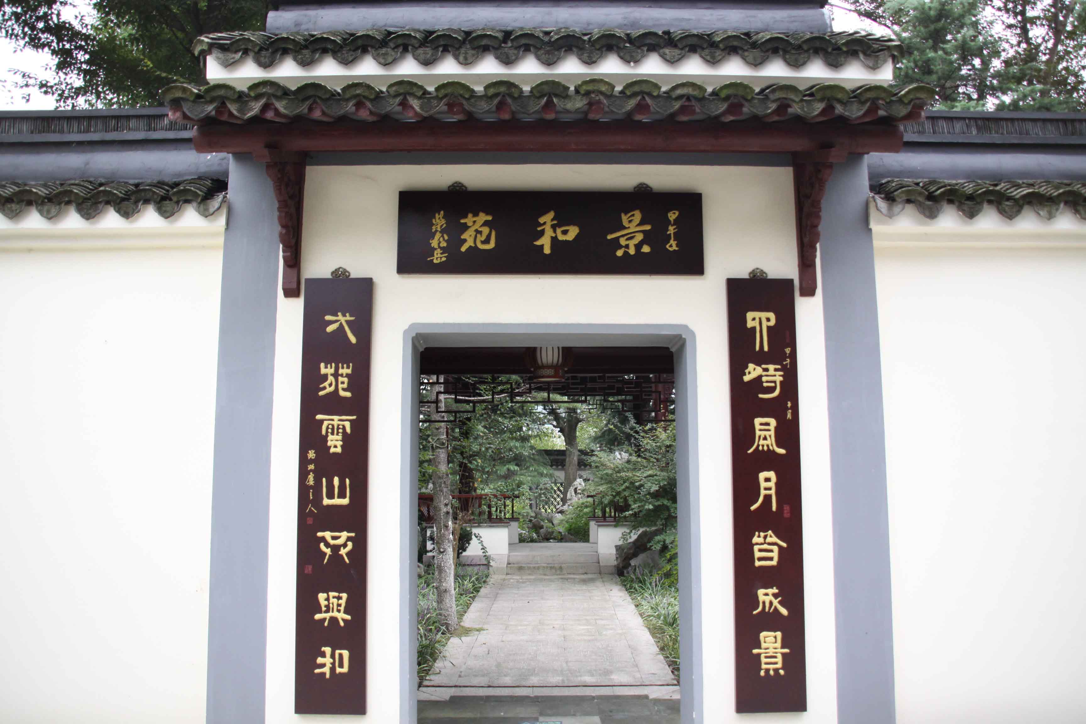 步入園內(nèi),右側(cè)圍墻有門洞開,上有“景和苑”匾額,取“春和景明”句意,由原浙江省省長柴松岳題寫。進門以迴廊花窗將沁檀園分割成東西兩園,西園以疏朗自然見長。