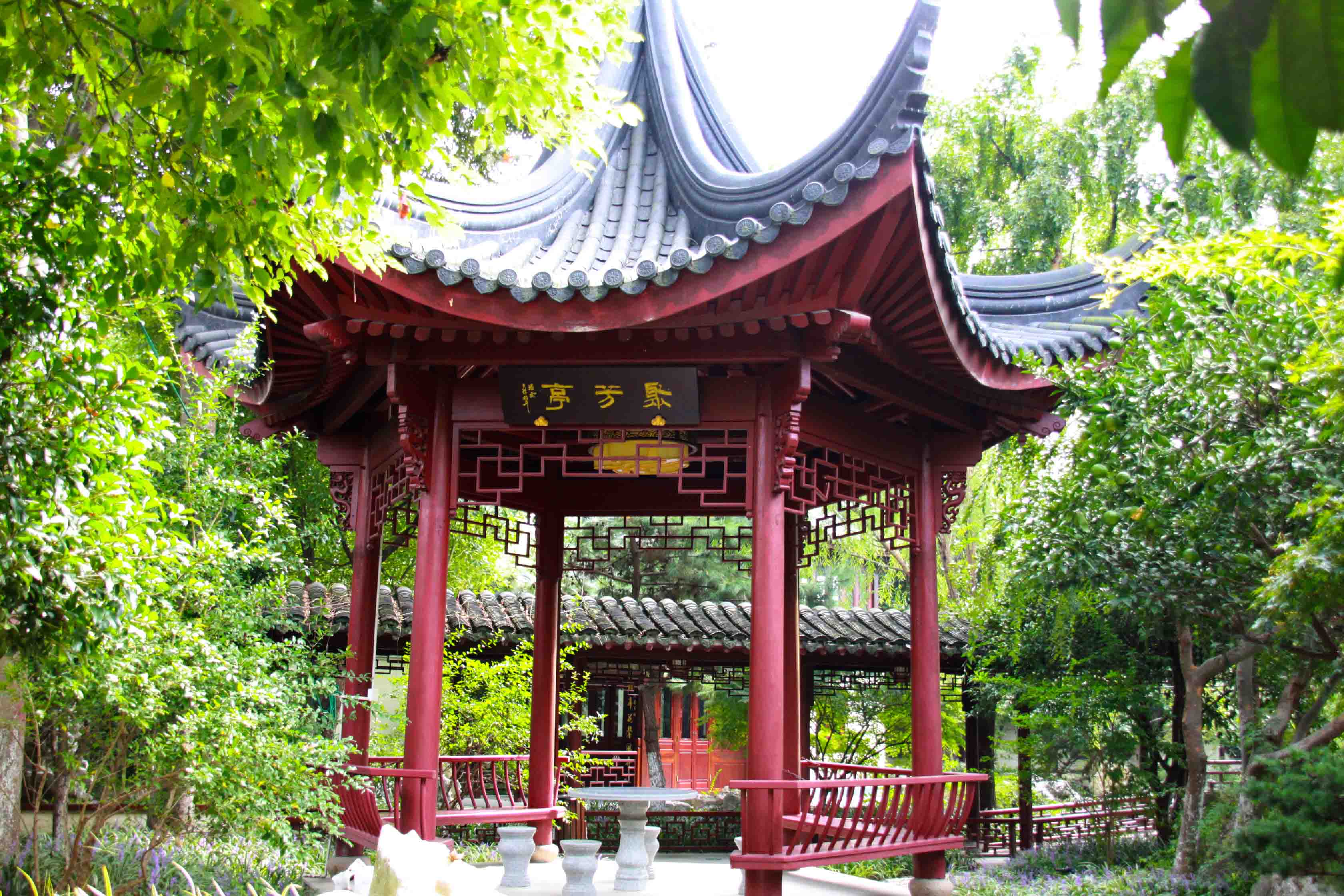 園內(nèi)建有 “具美亭”一座,四周綠草如茵,林木疏朗。亭位居正中,為四角攢尖,造型方正大氣,“三才相匯存真趣,四美咸臻促朗吟”亭聯(lián)為浙江詩人吳亞卿所撰,將匯才之名,景色之美嵌入其中。“具美亭”景色四時具美,又意紅木家具之美,一語雙關(guān),可見匠心。
