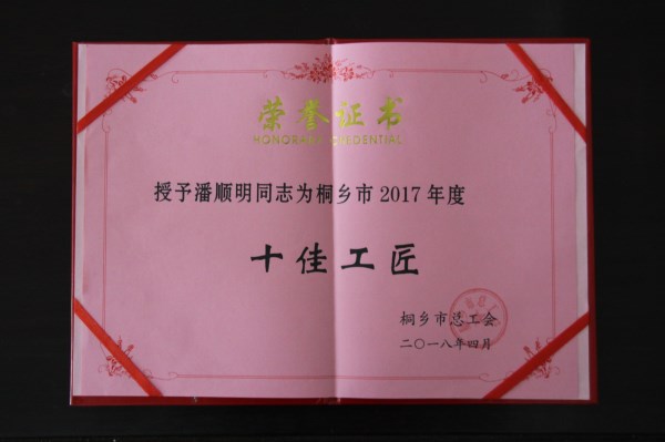 他技術(shù)能力過硬,為人謙虛,兢兢業(yè)業(yè)做事,踏踏實(shí)實(shí)做人,刻苦鉆研,精益求精,創(chuàng)建“潘順明高技能人才工作室”。嚴(yán)格要求自己,加強(qiáng)學(xué)習(xí),不斷提高自身修養(yǎng)和思想認(rèn)識,在工作中積極主動(dòng),充分發(fā)揮先鋒模范帶頭作用。他的工作態(tài)度和管理能力,以及深入一線,十幾年如一日的堅(jiān)持,獲得了公司全體員工的認(rèn)可。今年,獲得桐鄉(xiāng)市“十佳工匠”榮譽(yù)稱號。